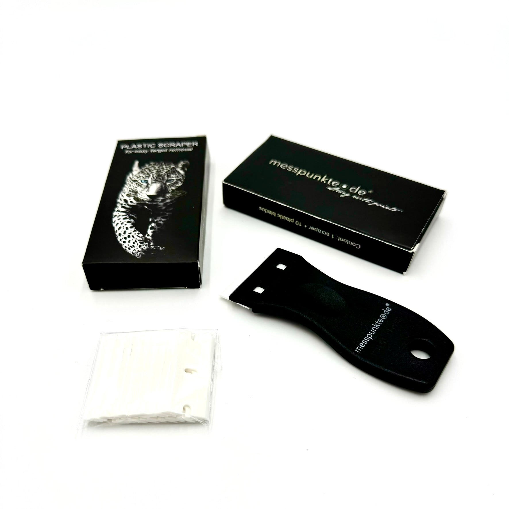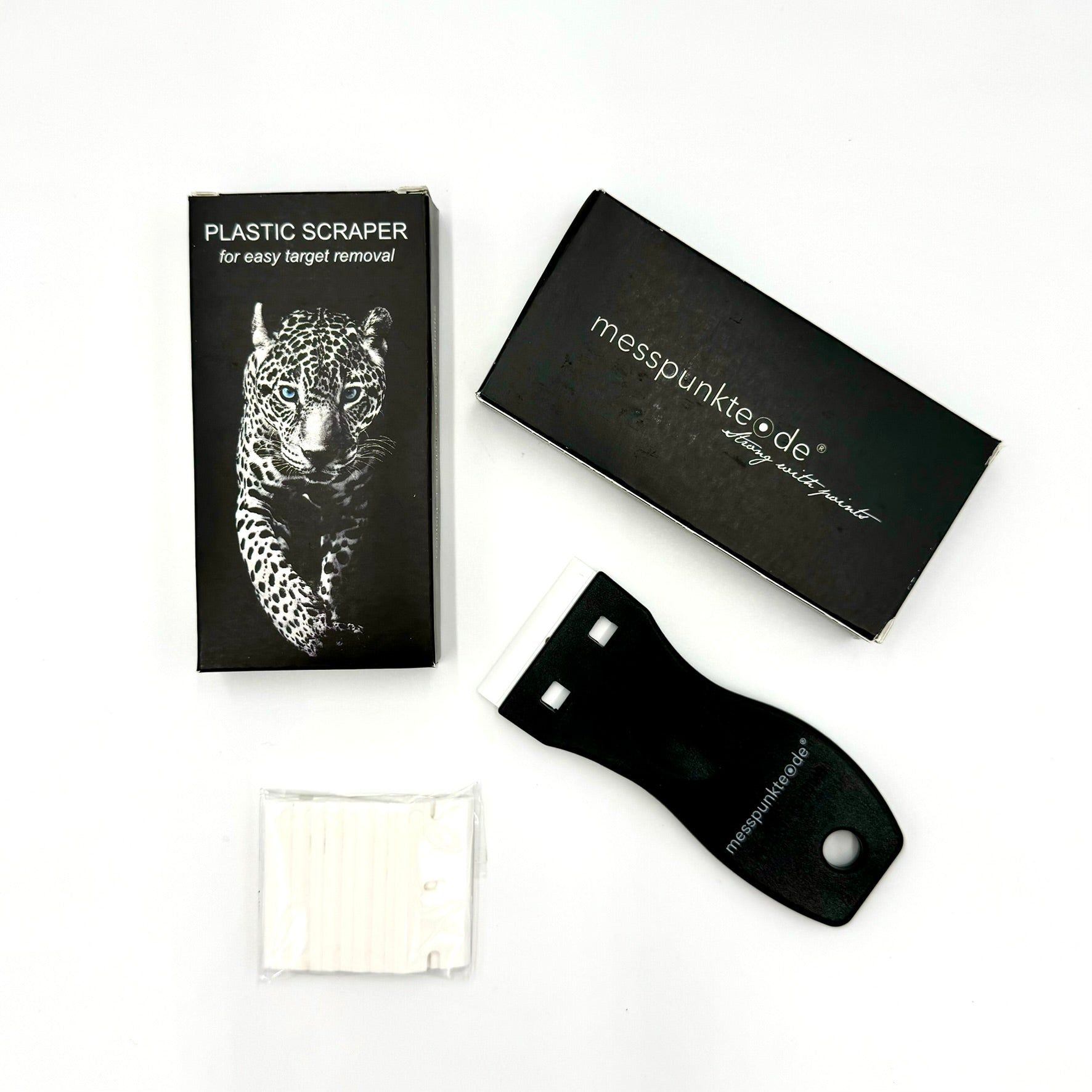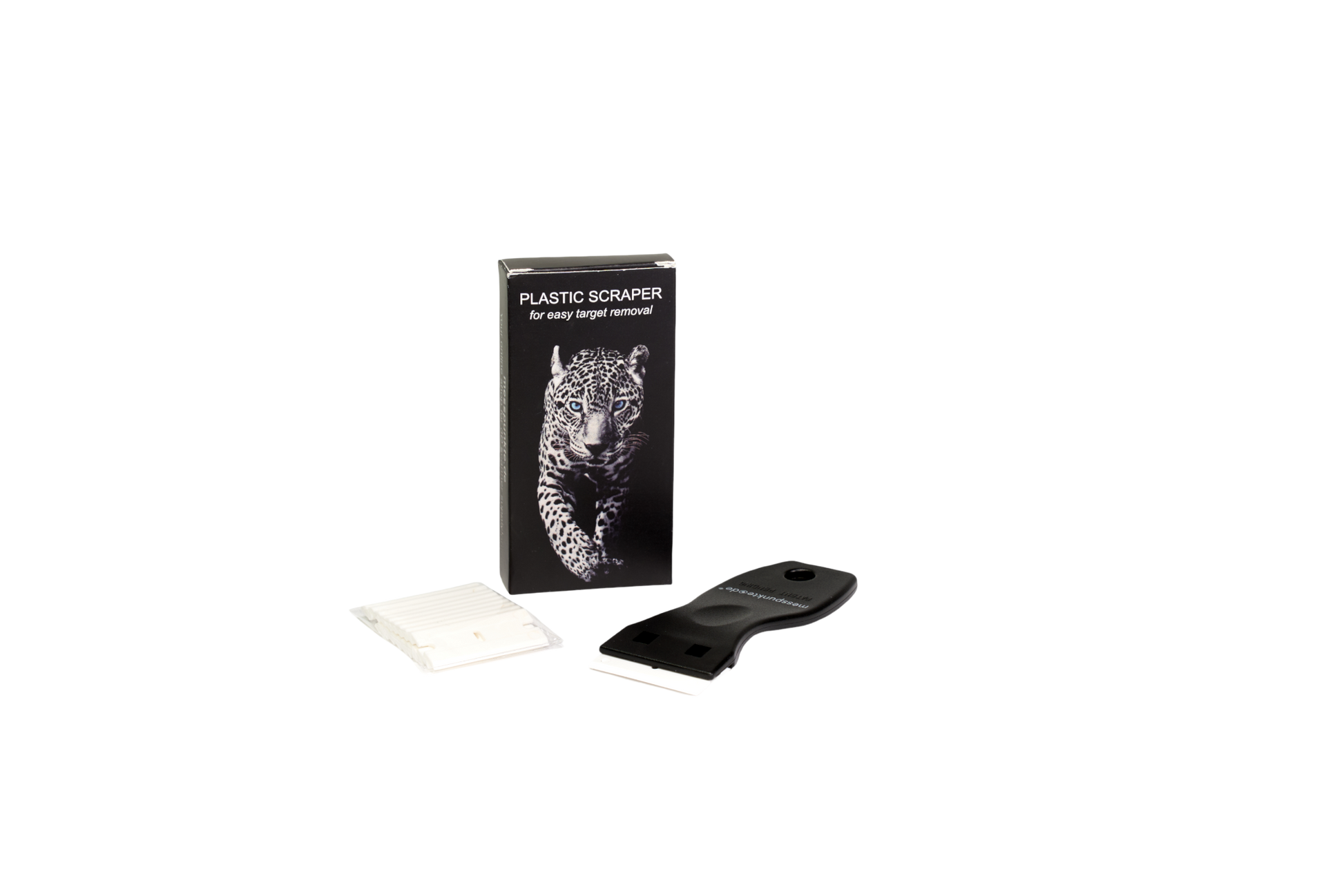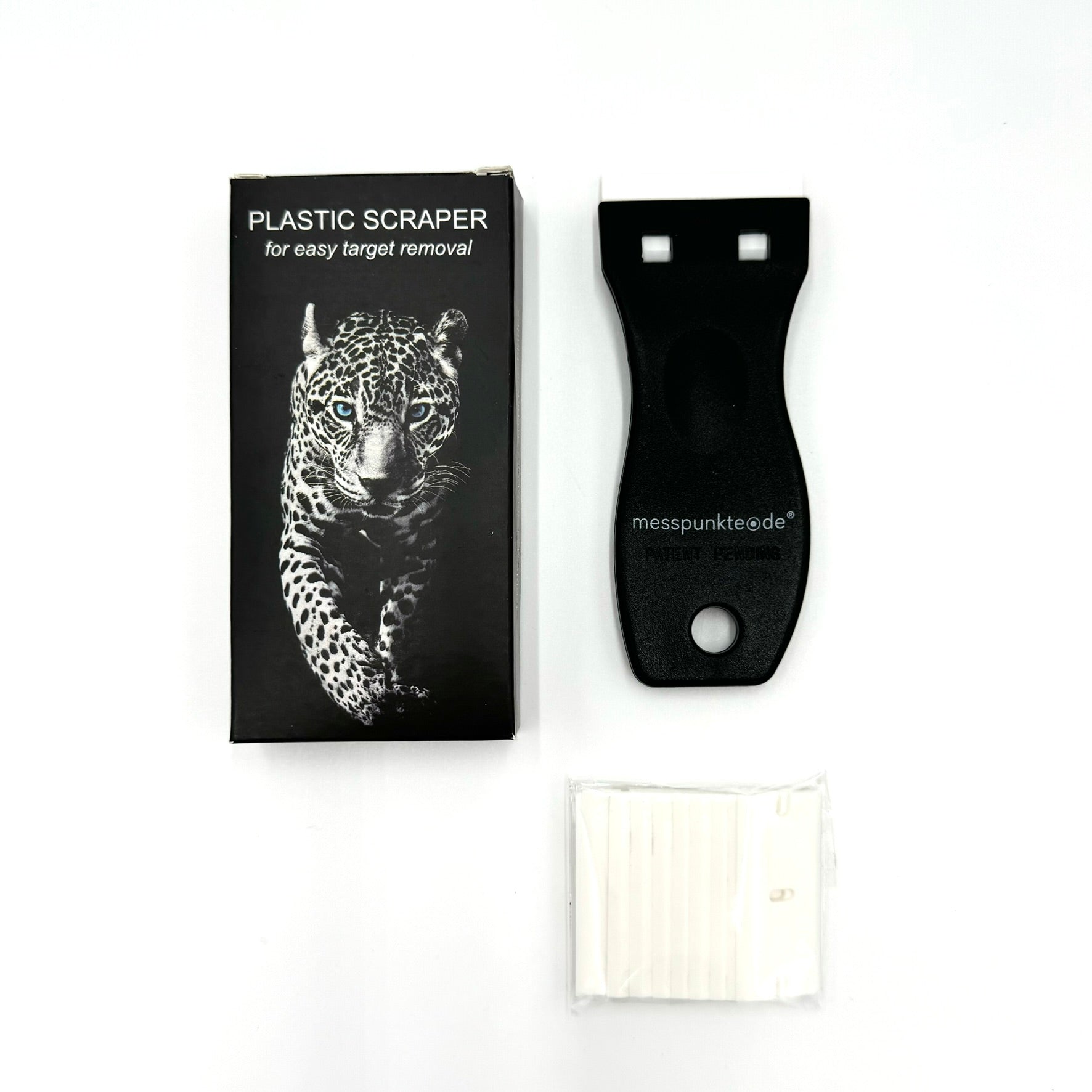 Easily remove 3D scanning targets with the plastic scraper. Includes replacement blades